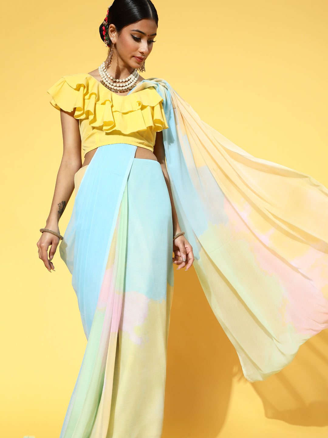 - A beautiful combination of a poly-chiffon fabric and a poly-crepe blouse, it will lend you an exceptional look.