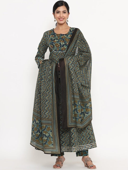 Yufta Women Green Ethnic Motifs High Slit Sequinned Pure Cotton Kurti with Palazzos & With Dupatta - S
